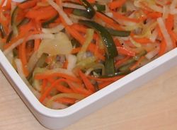 | 『きょうの料理』で大根のマリネを作っていたのを見てそうか、マリネもいいかも〜と残っていた胡瓜と人参と一緒に作ってみた。TVでやってたのとはかなり違ってますがしゃきしゃきして結構いけます。 |