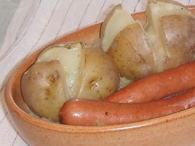 | ともあれ、できあがったのがこれです。本に載っていたのは出来合いのザウアークラウトを使うのではなく、生のキャベツをソーセージとレモンのスライス、塩胡椒と白ワインで蒸し煮にするというもの。ジャガイモは先に蒸し煮しておいて、シュークルートができあがるのに合わせてオーヴンで少し焼いてから同じ皿に。これに蕪とトマトのスープで夕食。うーむ、ヴルストがね...まずくはないんだけどね...まあ瓶詰だからね...何かこう、懐かしい味と言いましょうか。皮が軟らかいよう。でもジャガイモおいしゅうございました。キャベツもっと山盛り入れてもよかったかも。下に敷かれちゃって姿が見えず。 |