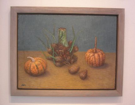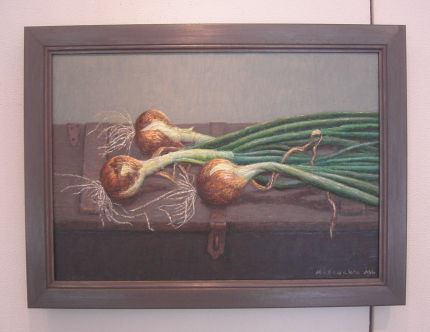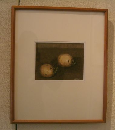 叔父が描くのは基本的に自分で栽培したものが多いが、これは山梨の高原にある畑のご近所さんから頂いた玉葱らしい。何でも叔父が作った玉葱が上手く育たなかった(標高が高いと寒くてあまり大きくならないらしい)のを見て玉葱ってのはこういうもんだー!と下さったらしい。来年はもっとどっさりやる!と約束されたらしいので叔父は「来年の個展には山盛りの玉葱絵を描く羽目になるのか」とちょっと怖れている模様。 |