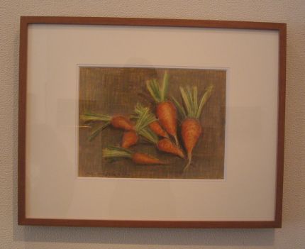 右はズッキーニ。丸いズッキーニは市場に出回っていないせいかとにかく珍しがられた。園芸店なんかに行くと種が売られているのを普通に見るけどね。一人だけ通りすがりに「ズッキーニが気になって...」と入って来られたお嬢さんがおられた。お嬢さんズッキーニ通だね?ちなみに味は細長いズッキーニと同じらしい。左の絵は個人的に気に入っていたのだがあまり注目されなかったようでちょっとしょんぼり。 |