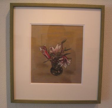 辛夷の花、これは水彩ではなく紙に油彩。個人的に額も含めてかなり好みだったけど、めでたくお買い上げ頂きました。この辺りの額はアクリルが入っているため反射しちゃってすみません。怪しい人影が写ってますな。 |
