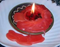 うわああぁぁぁぁぁぁぁ、こぼれてるこぼれてる皿の外にだらだらいってますよ!!皿の向こう側で見えなかった方に赤い鑞がでれでれ落ちているではないか。とか言ってるうちになぜか溶け残って壁のようになっていた蝋燭の縁に炎が燃え移ってぼうぼう状態に。上はぼうぼう、下はだらだら、なーんだ?とか言ってる場合じゃない。慌てて皿を持ち上げても鑞はこぼれる、手で受けるのも熱い。なな何か受けるもの受けるもの。もっと大きい皿か何か。おろおろ使ってもよさそうな皿を探す間にも鑞はでれでれ箪笥の上にこぼれる。待て、分かった!君の言いたいことは分かった!放置しておいて悪かった!話し合えば分かる!(←かなり混乱)慌てているせいかなぜか「一度火を消す」ということは思いつかず、とにかく大きめの皿を持ってきてその上に小皿ごと載せると何とか落ち着いた(いや気分が)。その後さすがにその皿から溢れるまでにはならず鑞は溶け切った...が、芯は残っているのでそれがいつまでも、いつまでも、いつまでも、いつ(以下略)ぼそぼそと燃え続け、机に向かっていても時々背後からぱちぱちぼこぼこ音が... 結局最後は消しました。夜寝てる間もぼーっと燃えてたら怖いじゃないですか(涙)。