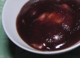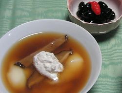 関東と違って、うちの実家の方では年越し蕎麦を食べる習慣がなく、大晦日の夕食は普段よりも品数が多く豪華なメニューになる。今は色々省略する家庭も多いようだしうちの実家も昔に比べるとかなり手間を省いているが、今でもこの日だけはお膳を出している。で、元日は関東のようなゴージャスなお節料理は作らないが、朝からつきたての餅が食卓にのぼる。お雑煮ではなく、鰹と椎茸の出汁の醤油味の汁と小豆のこし餡をゆるく溶いたものを別々の鍋に用意して、そこにつきがけの餅を千切って入れる。下の写真の左側が「汁(つゆ)餅」右側が「あんこ餅」。汁餅の上に載っている白いペースト状のものは胡桃を摺って塩少々と水で溶いたもの。汁でも餡でもこれを少し入れると香ばしく味がまろやかになっておいしい。右上にある黒豆の上に載っている派手な色の物体が以前掲示板でちょっと話題になった長老儀(ちょろぎ)でございます。一応ご馳走なんだけど写真に撮ってみると著しく地味ですな。ごちゃごちゃ置いてある周囲のものを省いたら凄いクローズアップ写真になってしまいました。