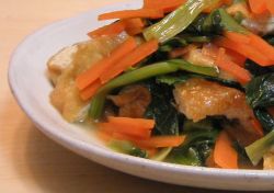 | しばらく前にデパート内の豆腐屋さんの惣菜売場で買った湯葉と小松菜の炊き合わせが大層おいしかったので、湯葉を薄揚げに変えて(高いしね...)作ってみた。人参を入れると色合いも華やかになってまたいい感じ。この翌日これにマイタケを加えてみたがこれもまた良し。 | ![]() |