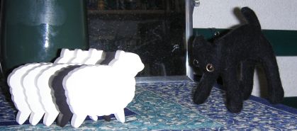 にゃんこ、ひつじ集団と対峙。後がないですよあなた。あ、後ろの鏡が埃だらけ(写真に撮ってみて気づく)。