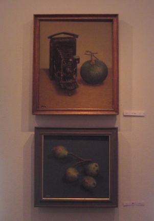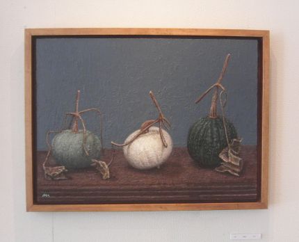 上は古いカメラと南瓜、下は枝付き花梨。このカメラの絵も個展に出したのは初めてで、なかなか受けが良かったような。何度か以前の個展も観てくれているわたしの友人Nは「以前はあまりなかった無機物(カメラ)と有機物(南瓜)の組み合わせが面白い」と言っていた。 |